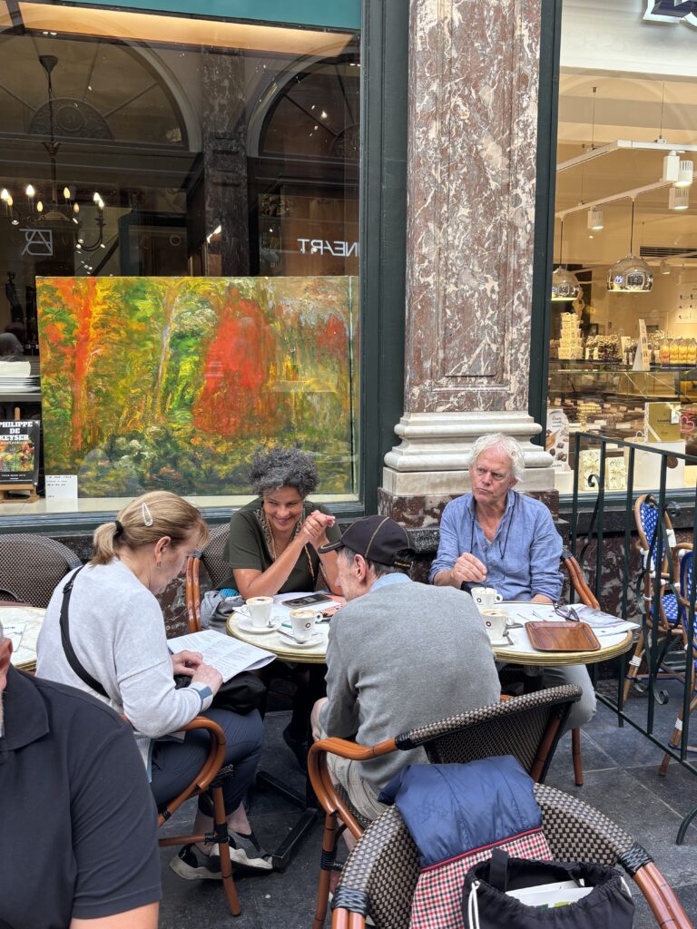 Nei in nachtsje yn in hotel (djoer en ferrekt lyts keammerke) en in streksum moarnsbrochje hat ûndertekene wat omdoarme yn Brussel. Minsken, wat in minsken! En ik mar miene dat it yn Amsterdam in gekkeboel is. Hawar, om in oere of alve ha ik my melden by de rest fan de klup op it terras fan de Koninklijke Sint-Hubertusgalerijen. It siet dêr ferdomde noflik, kofje en hearlik waar derby. It wie de bedoeling dat wy gedichten skriuwe soene foar de minsken, meast toeristen, dy’t foarby kuieren. Ik ha in alderaardichst petear hân mei in Frânske Kanadees op leeftyd dy’t neffens him mar ien ‘poet’ koe en dat wie Leonard Cohen. Underwilens makke myn Portugese kollega Margarida in Frânsk gedicht foar syn frou. Sels ha ik noch in fers skreaun foar in frou út Brabân. Se like der wol wiis mei te wêzen mar hie ik wat mear tiid hân dan wie it echt poëzij wurden.