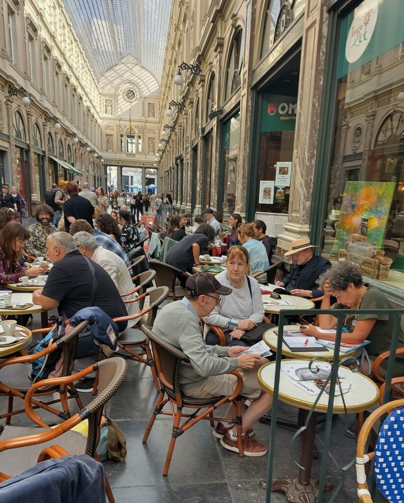 Dêrnei giene wy rinnend fierder nei de Keninklike Galerijen, in plak dêr’t neffens ús host gjin Brusselaar te finen wie, mar wol in soad toeristen. Axl hie ús ûnderwilens ferlitten om nei it muzykynstrumintmuseum te gean. Toeristen wiene no ús doelgroep, want we giene gedichten foar harren skriuwen. We waarden as dichters oan taffeltsjes set yn de moaie Art Nouveau-hallen mei papier en in pinne, en minsken mochten oanslute by in taal nei winsk. Underwilens wiene der in dichter út Spanje, Poalen, Litouwen en Italië bykaam. Ik skreau gedichten foar ferskillende Flamingen, foar in lyts hûntsje en foar de ober. It wie hiel bysûnder en leuk, foaral om talen mei elkoar te mingen en de pear wurdsjes dy’t ik praat brûke te kinnen. Dit fûn ik echt it geweldige ûnderdiel: minsken giene mei in bliid gesicht fuort en ik mocht lekker skriuwe. Underwilens dronk ik in lekkere Kriek, sa’t dat yn Brussel kin.